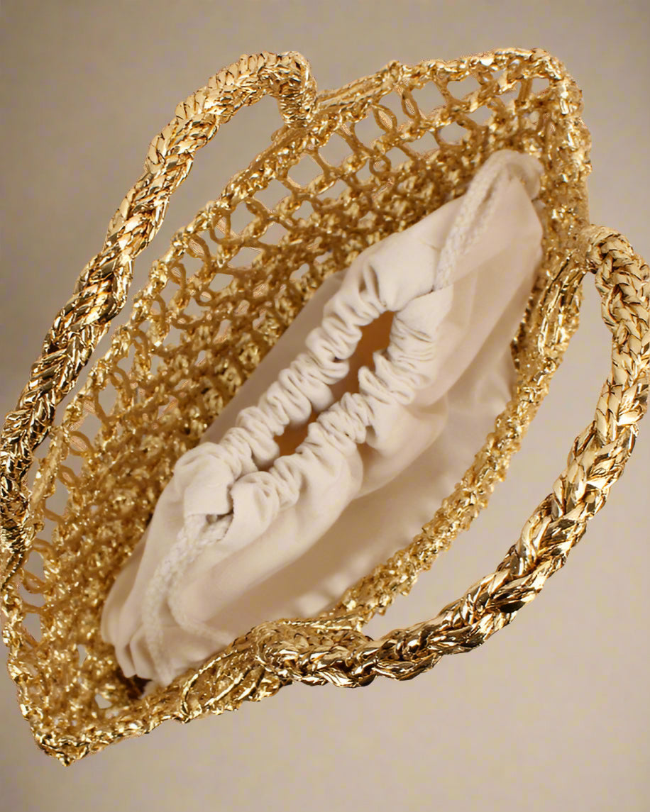 Solstråle Taske forener naturlig charme med et tidløst, håndlavet udtryk. De åbne fletmønstre giver et luftigt og sommerligt look, mens den medfølgende inderpose sørger for, at dine ting er sikkert opbevaret.